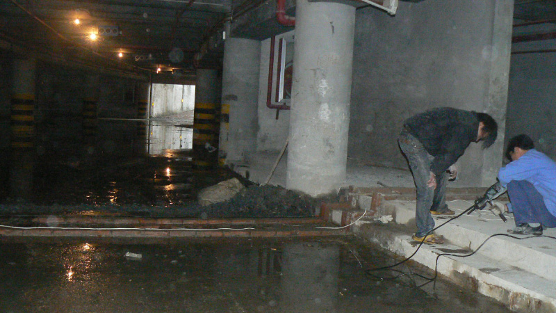 地下車庫(kù)使用時(shí)間久后,后澆帶有部分滲水現(xiàn)象,且越來(lái)越大,泥沙也一起沖出。公司技術(shù)人員根據(jù)現(xiàn)場(chǎng)勘察情況,經(jīng)過(guò)分析研究,采用“圍堵置換”工藝施工,在漏水點(diǎn)周圍2米處打2.5米深孔注漿,用以圍堵水源,同時(shí)把漿液填充到被沖出泥沙原部位,當(dāng)漿液達(dá)到一定濃度時(shí),凝固成膠體,阻斷其它滲水源的進(jìn)入,同時(shí),漿液在進(jìn)入滲水區(qū)域后膠凝,漏水通道也得到阻塞。經(jīng)過(guò)治理,再無(wú)滲漏。