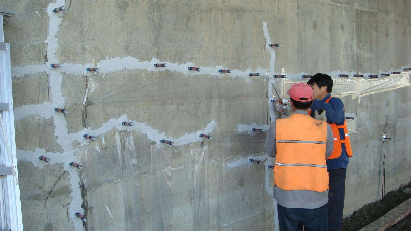 該地下停車(chē)場(chǎng)頂板、立壁、沉降縫等處滲水,經(jīng)多次維修均未達(dá)到預(yù)期目的,甚至愈加嚴(yán)重。根據(jù)承建方提供的資料與現(xiàn)場(chǎng)勘察情況,技術(shù)人員結(jié)合多年維修經(jīng)驗(yàn),采用公司好的材料進(jìn)行注漿止水施工,經(jīng)過(guò)兩個(gè)多月緊張、有序地施工,滲漏水問(wèn)題得到徹底解決。承建方對(duì)開(kāi)來(lái)公司的施工效果給予高度地評(píng)價(jià)。